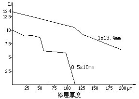 每涂刷一次油漆,待其干涸后,用千分尺測量漆層厚度(鋼板總厚度減去事先測定的鋼板板材厚度),并進行一次粉探傷測試,記錄觀察結果,然后再涂刷一遍油漆,重復上述步驟,直到漆層厚度達到198微米。由于一直是在同一個缺陷部位測試,可以避免人工缺陷、鋼板厚度以及鋼板材料成分和冶金組織變化造成的影響。